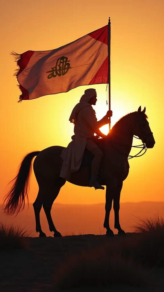 صورة فارس عربي على حصان في وقت الغروب والشمس من خلفة ويحمل بيدة علم العلويون المكون من راية بيضاء وفي الزوايا الأربعة مثلثات حمراء وفي المنتصف شمس