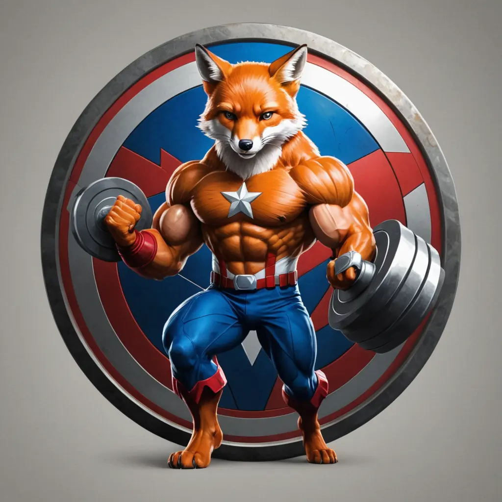 ثعلب يحمل اوزان الجيم ومليئ بلعضلات علي شكل لوچو بخلفيه درع كابتن اميركا ممتازه