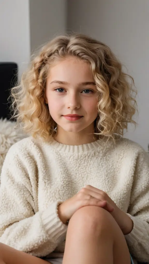 beautiful 13yo girl ((blonde frizzy natural hair in a bobcut)) sitting on a fluffy sheepskin