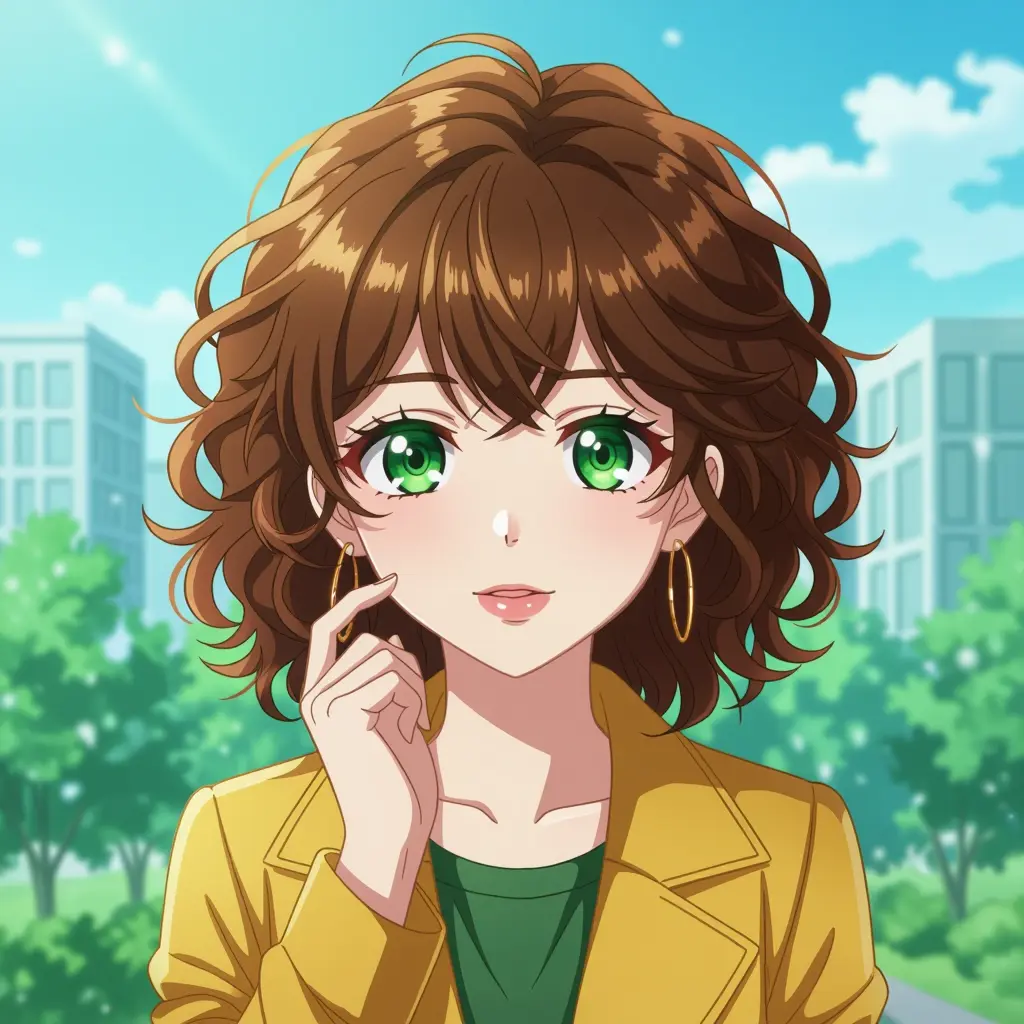 فتاة انمي شعرها كيرلي مجعد بني و عيونها خضراء مقاسات شكل وجهها 57% Square