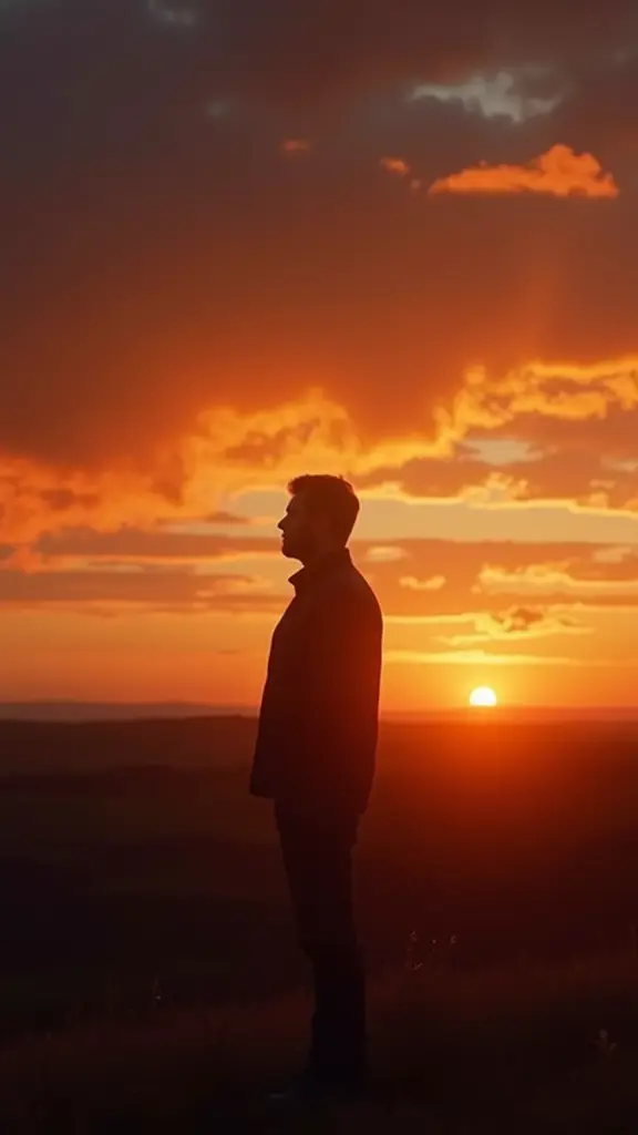 صورة ظلية لرجل عند غروب الشمس، سماء مثيرة، الصوره سنمائيه بدقة 8k