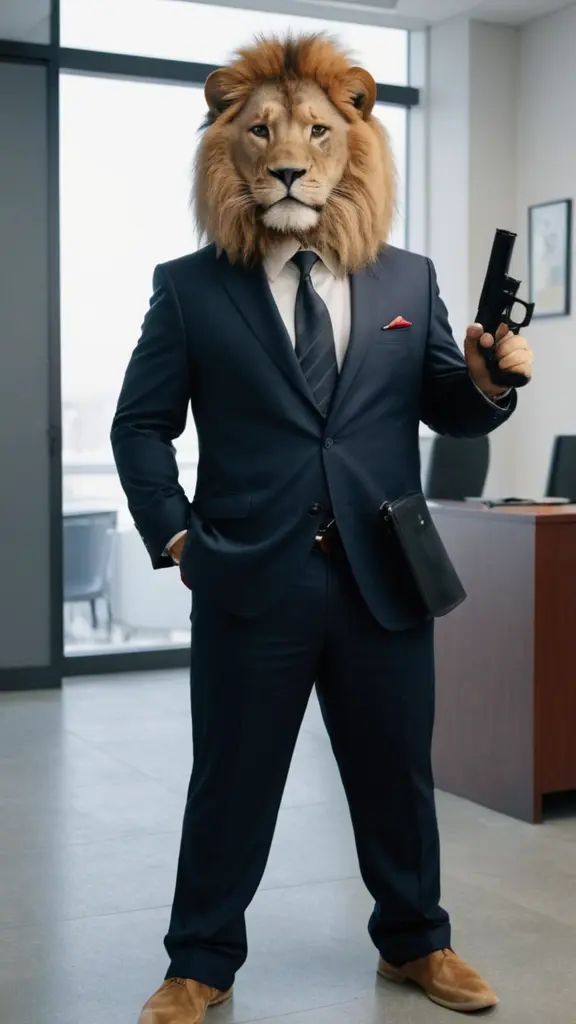 اسد يرتدي بدلة و يمسك مسدس و يقف امام المكتب