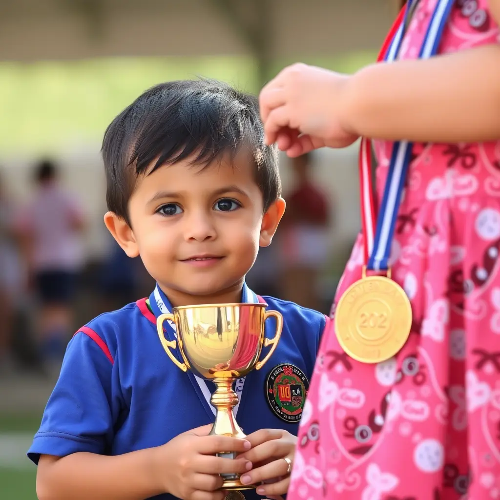 صورة لطفل يحمل كاس من ذهب ويحصل علي ميدالية ذهبية