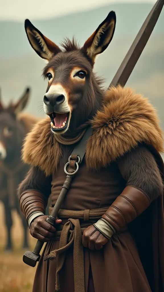 حمار مقاتل راس حمار ويسلخ هذا جلد الاسد حاطه على كتفه ويحمل سيف كبير وراه الحمير يضحكون في جسم بشره وراس حمار