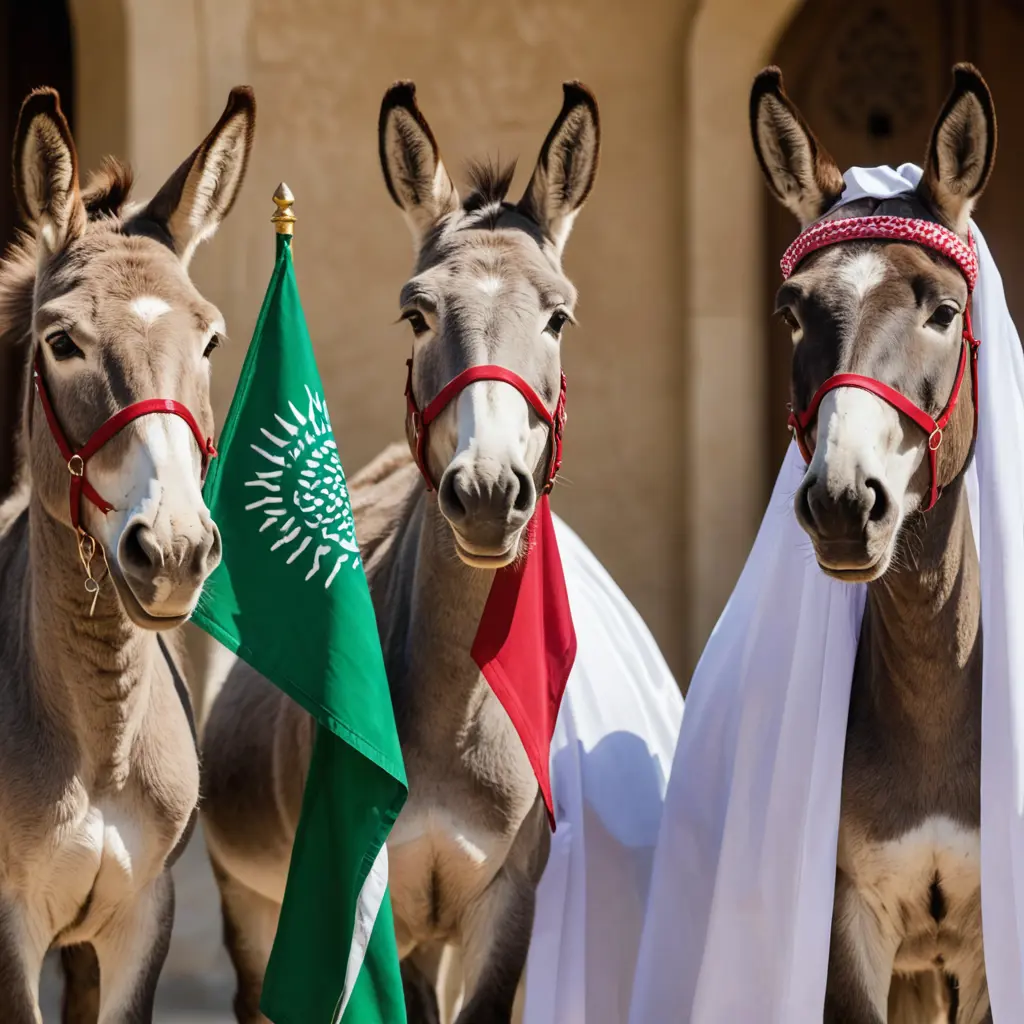 حمار يلبس صورة العلم السعودي وبجانبه حمار يلبس علم قطر وحمار اخر يلبس علم البحرين وحمار اخر يلبس علم سلطنة عمان وحمار كبير يلبس علم الامارات