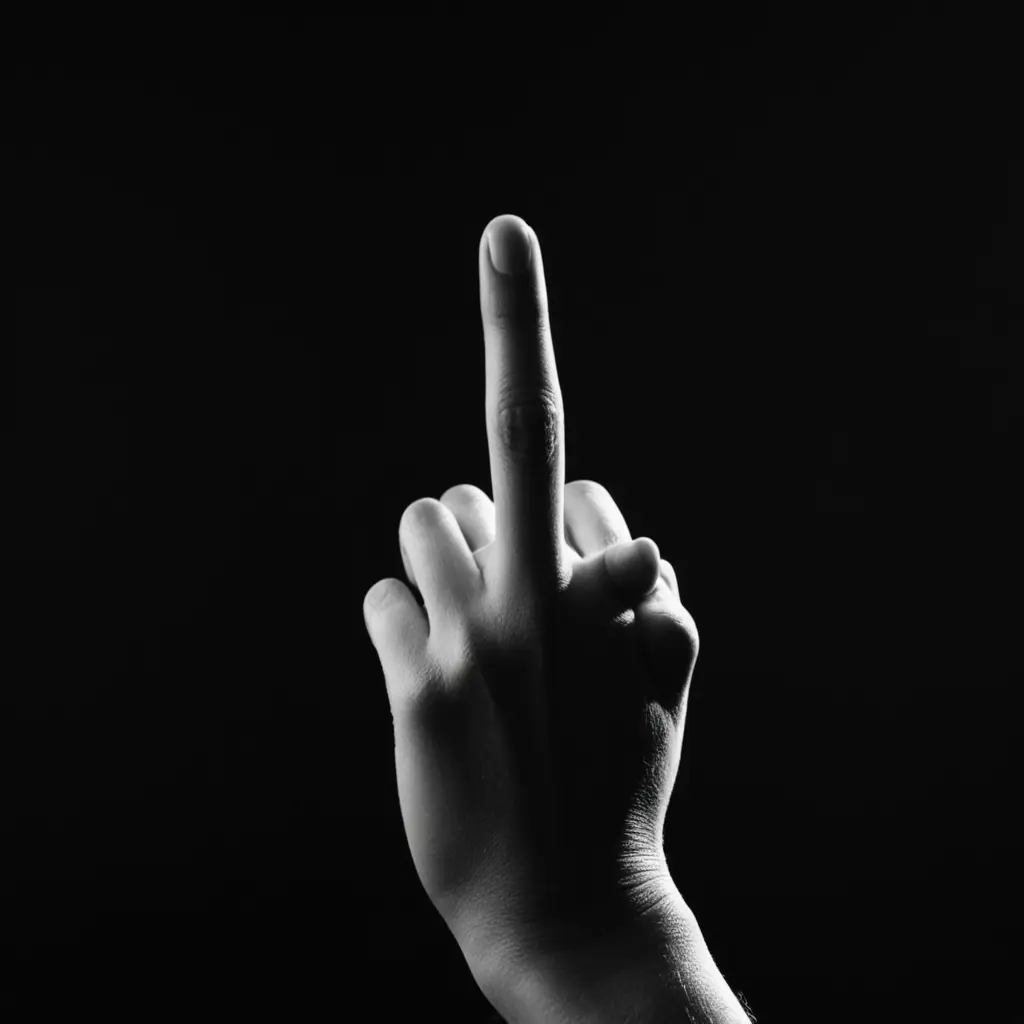 صورة فخمة اسود ابيض مستدير الظهر ورافع اصبع فوق خلفية سودا