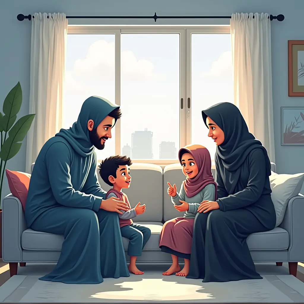 اريد صوره لعائلة محافظة مسلمة ينصحون ابنهم الوحيد و هم شخصيات كرتونية للمشاركه باكاديمتنا للنادي الصيفي المليء بالمغامرات وكره القدم والفعاليات والانشطه القوية وشرطي ان تكون الصوره بالالوان الازرق والاسود والابيض و هم يجلسون في صالة بيتهم الكبيرة