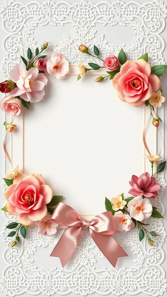 بطاقة عرس بزهور وشريط، وسط فارغ، ألوان ناعمة، نقوش دانتيل