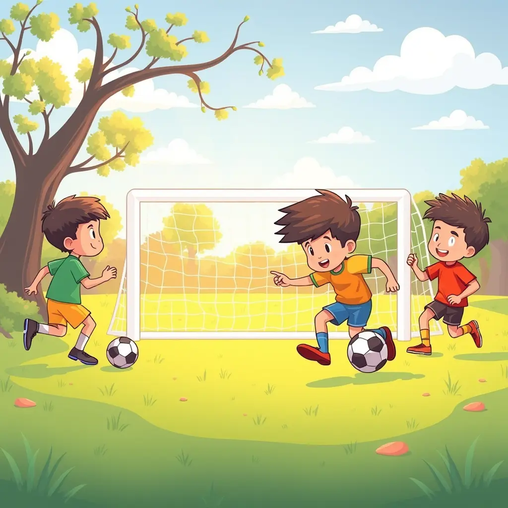 طفل يلعب كرة قدم مع اصدقائه ويدخل هدف في المرمى....صور كرتونية للاطفال