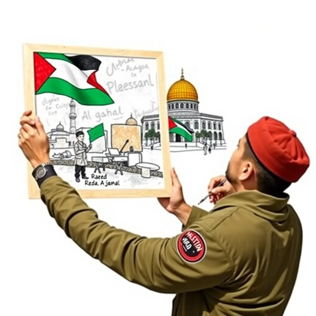 رجل يحمل علم فلسطين ويرسم لوحة لفلسطين والمسجد الأقصى ويوجد ولد في اللوحة يحمل علم فلسطين ومكتوب أسفل اللوحة رائد رضا الجمال والرجل الذي يرسم اللوحة يرتدي ملابس جندي لفلسطين ويحمل علم فلسطين