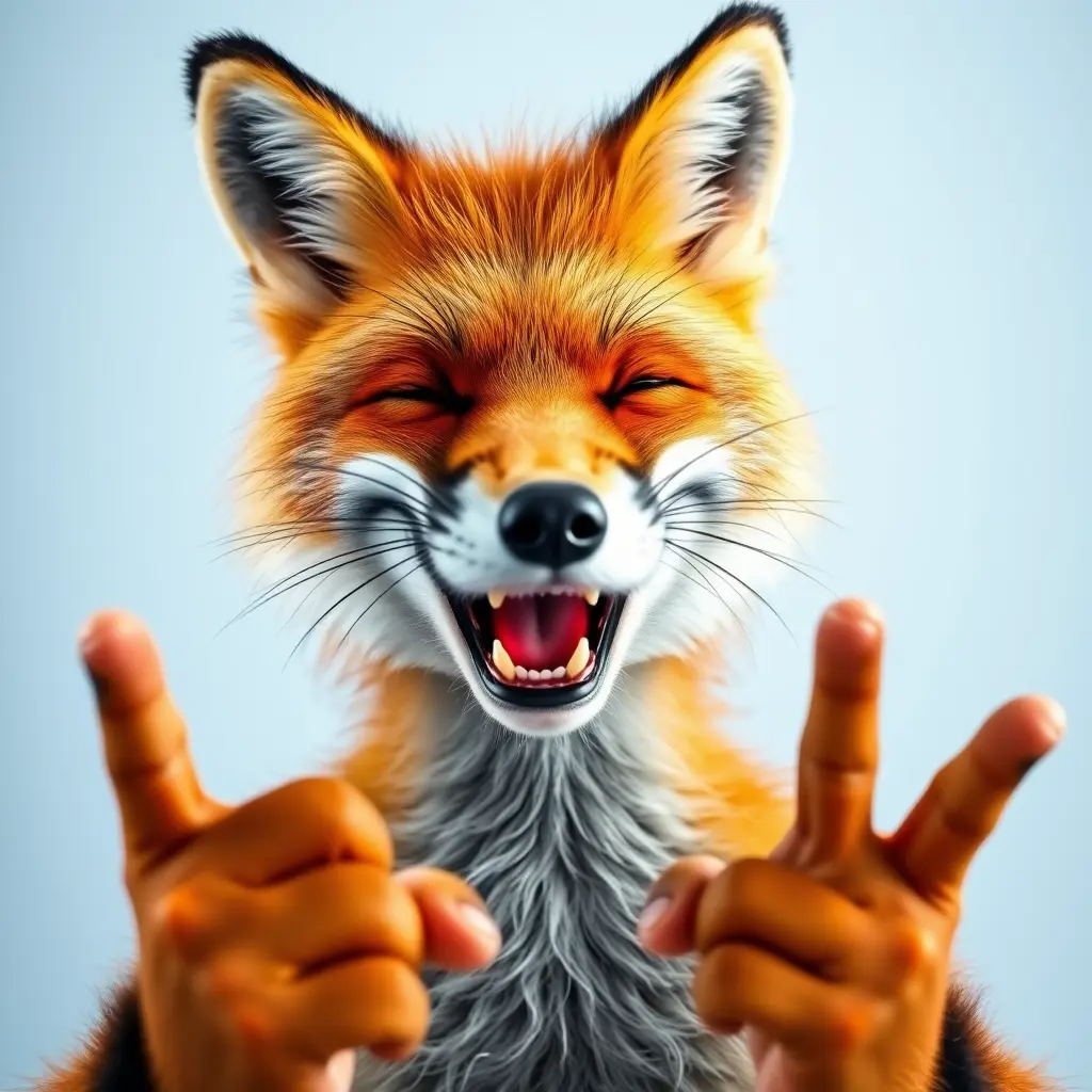 وجه ثعلب كوجه إنسان يضحك ويشير باصبعه علي الشاشة كانما يضحك علي المشاهد يداه تكون سمراء