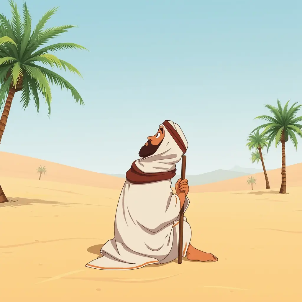 رجل بدوي بزي اسلامي قديم يجلس على الارض في صحراء ونخل  حزين ومهموم ويمسك عصاه. وينظر للسماء  بدون ظهور وججه فقط من الجنب صورة كرتونيه مجسمه