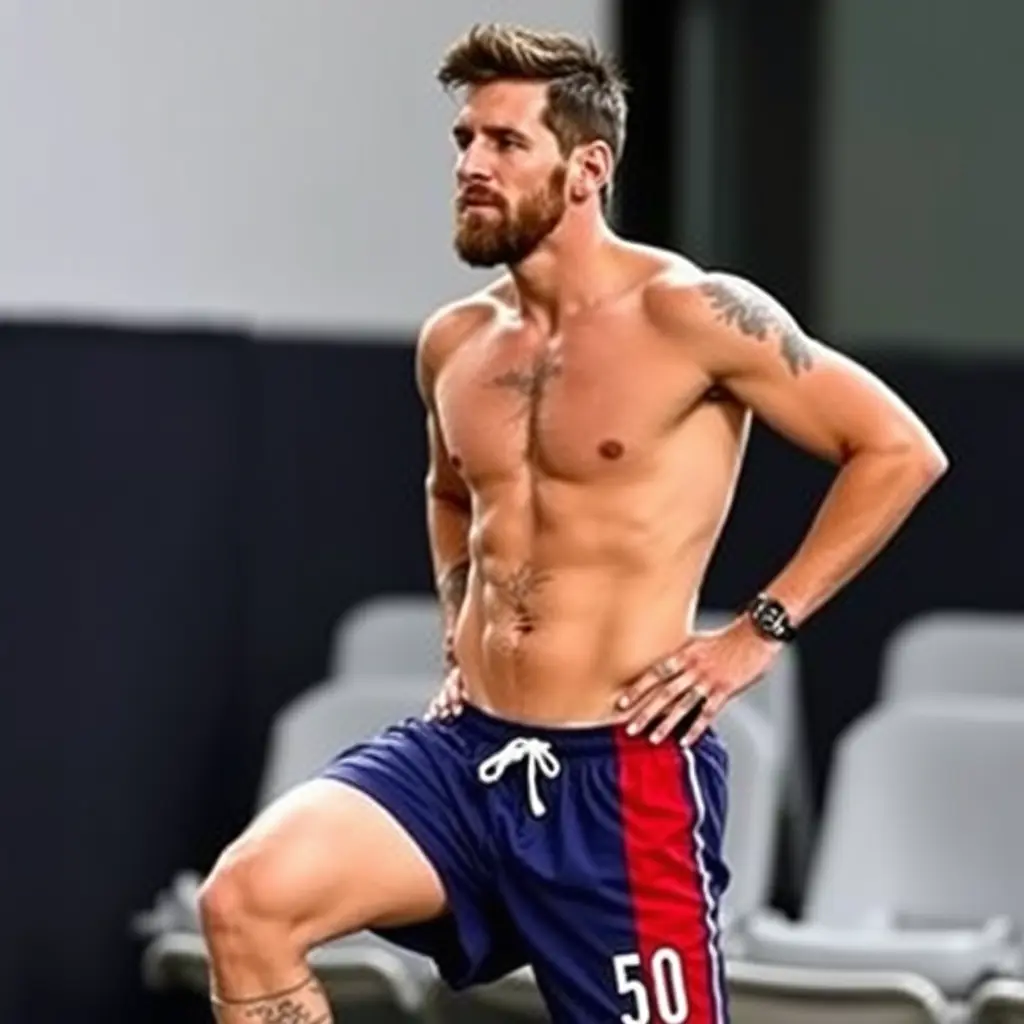 ليونيل ميسي يستعرض عضلات بطنه وهو لابس شورت رياضي فقط