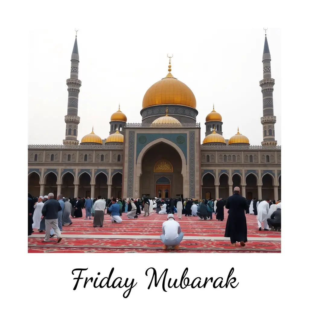 صورة مسجد ومصلين مكتوب عليها جمعة مباركة وبخط اصغر على أسفل اليسار ابو اسيل
