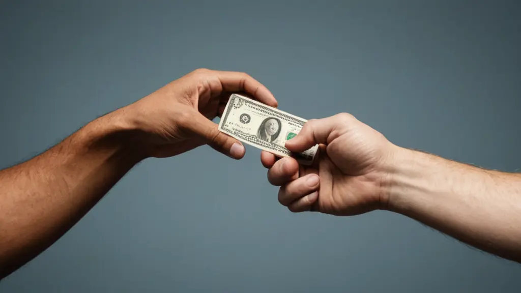 صورة يد رجل تعطي وثيقة شيك مالي، ويد أخرى لرجل آخر يمنحها ورقة دولار