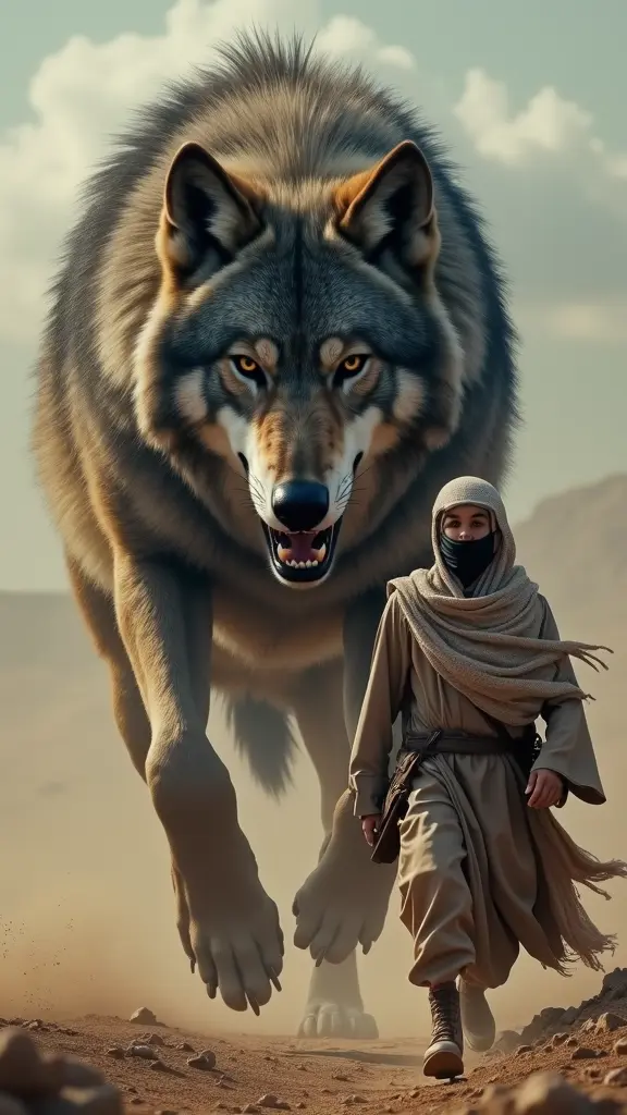 ذئب ضخم و شرس و غاضب وراءه شاب عربي وسيم و ملثم