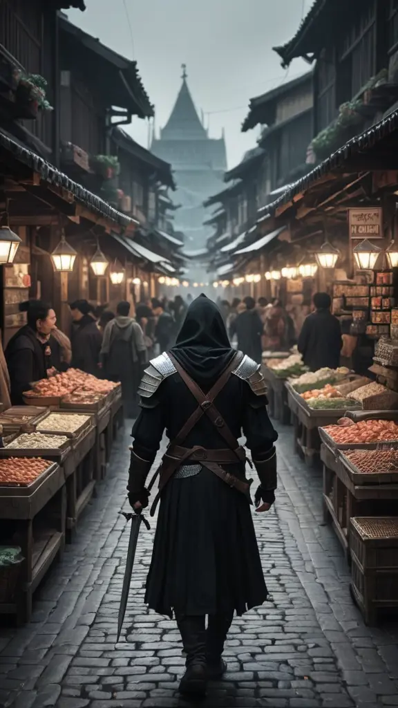 Dark Fantasy Pixel محارب يتمشي في السوق في الدارك فانتزي ويكون السوف عباره عن طريق طويل مليئ بالاشخاص ن