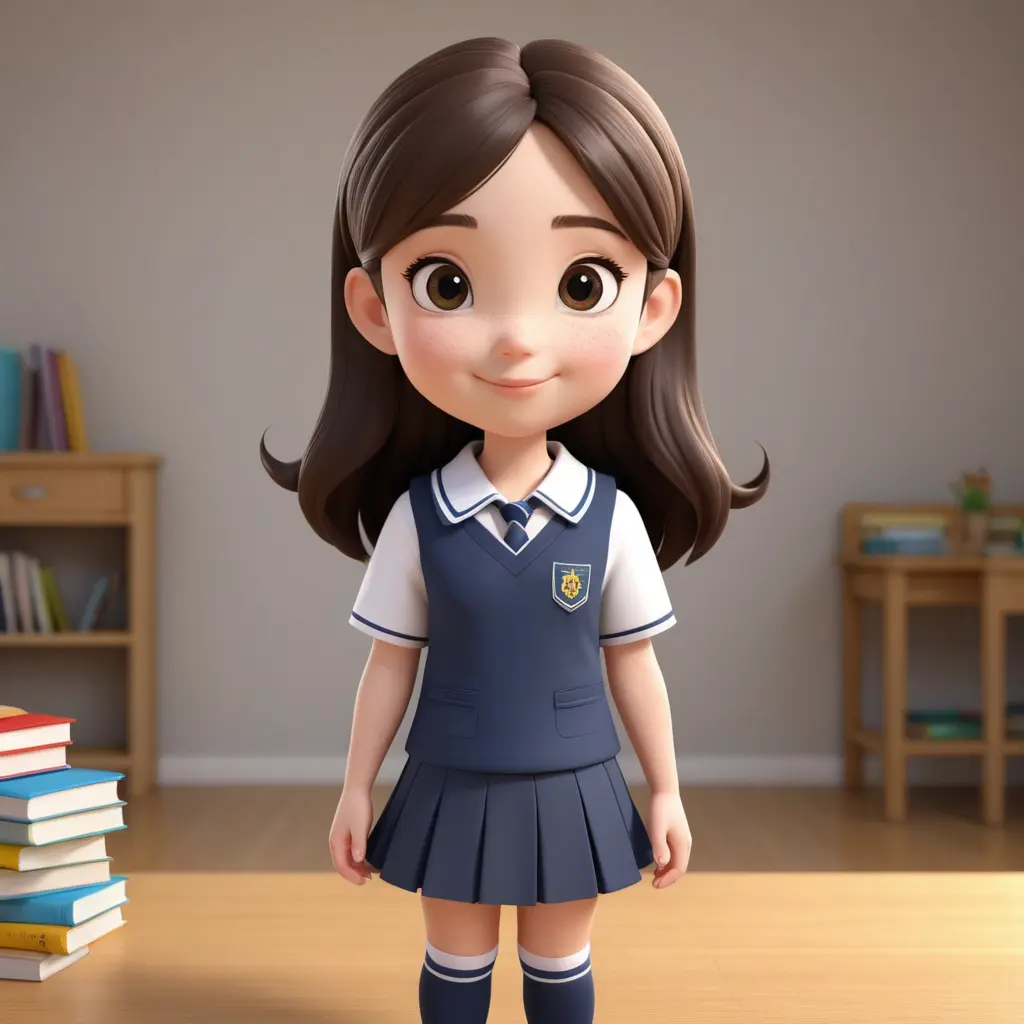 بنت شخصية كرتونية ثري دي ، يرتدي زى مدرسة ، تحصل على كتاب مدرسة مجانا