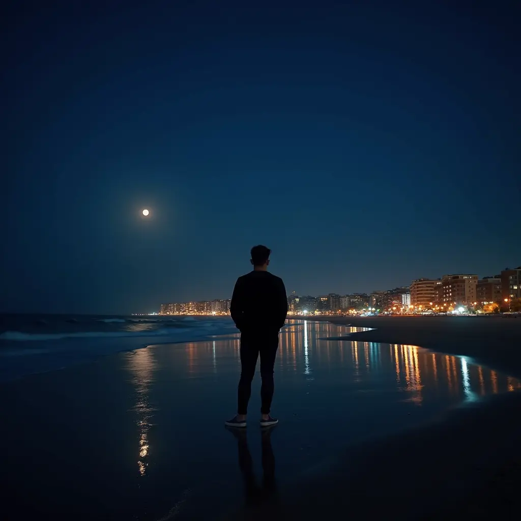 صورة ليلة بشاطئ بحر هادئ و قمر بضوء باهت و شخص واقف بساحل الشاطئ برتدي ملابس سوداء مع أضواء المدينة الليلية الساطعة