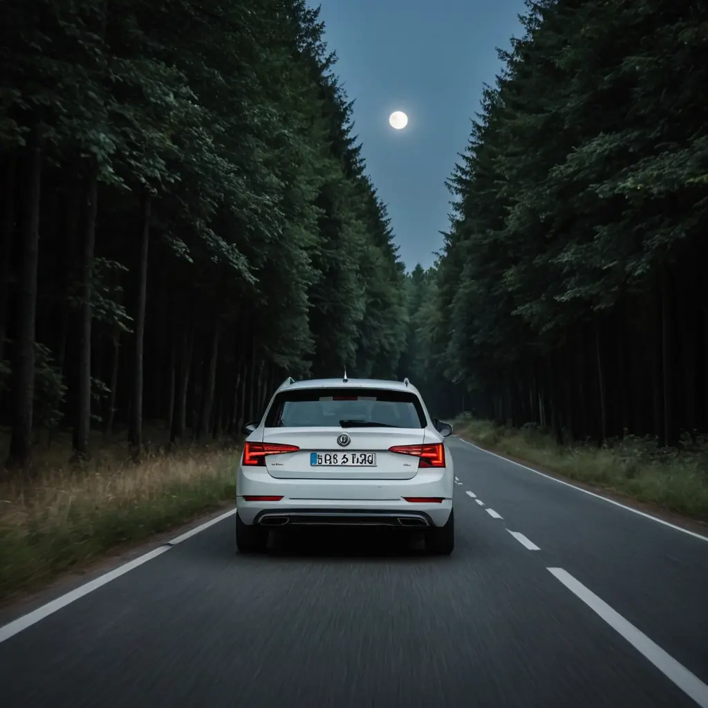 سيارة بيضاء وسط طريق بجوانبه شجر عالي وكثيف وقمر في المنتصف واجعلها سيارة من نوع سكودا اجعل الصورة اكثر ظلمة