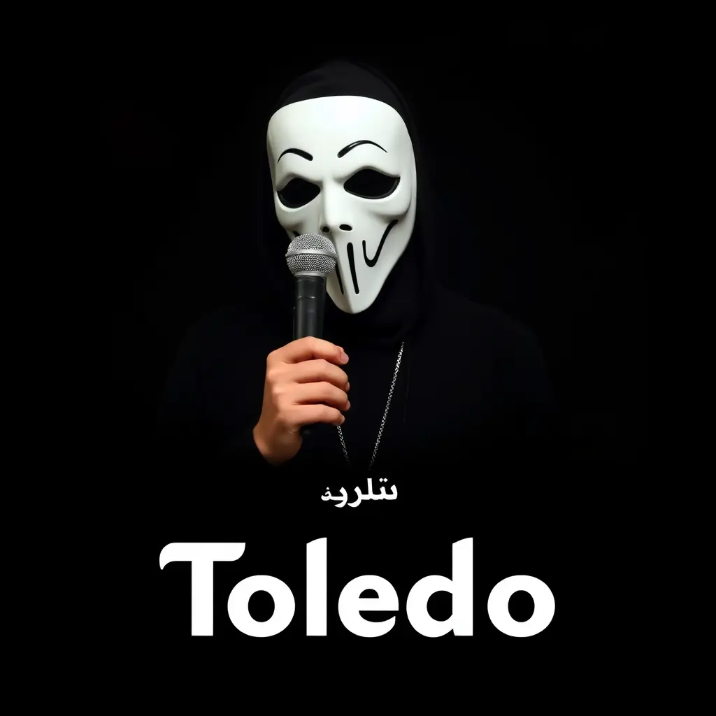 رجل لابس قناع ابيض وملابس اسود وماسك مايك ومكتوب بالعربي طليطله العمامي