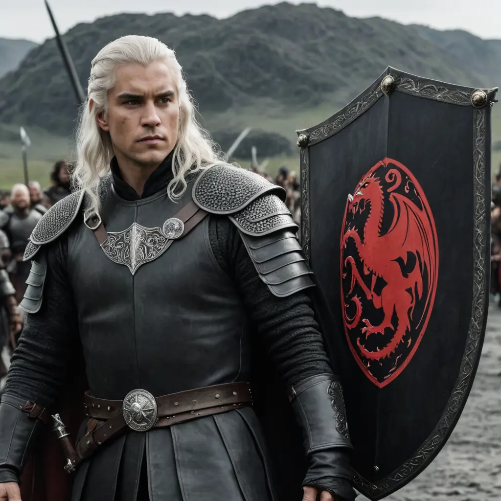 رجال ذو شعر ابيض طويل يرتدي درع اسود عليه شعار التارغيريان رافعا سيفه