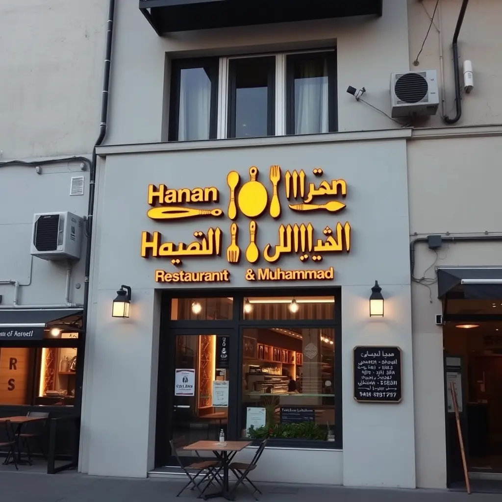 بناء مطعم باسم حنان كنعان ومحمد والاسم مكون بأدوات مطبخ