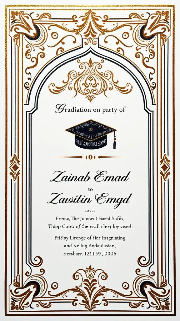 بطاقة دعوة لحفلة تخرج بأسم زينب عماد بلون ابيض و ذهبي و خطوط سوداء على شكل تاريخي بابلي و اندلوسي