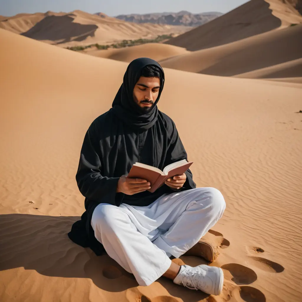 شخص جالس وسط الصحراء يلبس اللبس الطارقي المعروف و يقرأ كتاباً