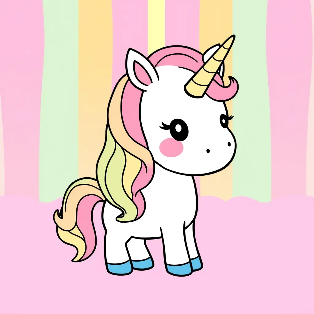 “Cute cartoon unicorn, pastel colors, rainbow background, children’s illustration style, kawaii aesthetic, simple and clean lines, vector style, suitable for kids coloring book”