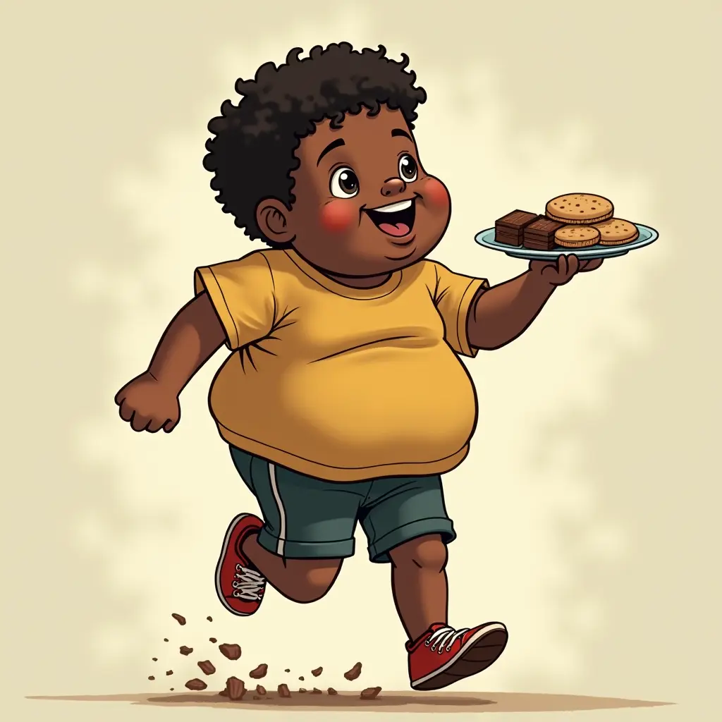 ولد اسمر البشره سمين يركد وبيدة صحن من البسكويت والشوكولا