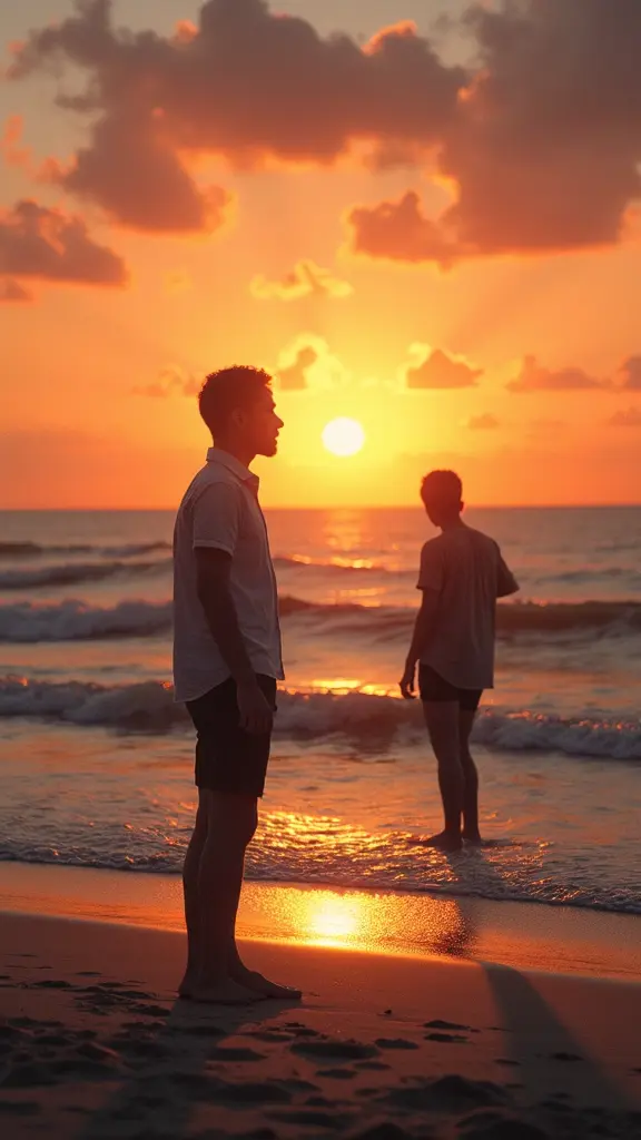 شخص يقف على شاطئ البحر عند غروب الشمس ينظر نحو الأفق بعينين تحملان الحنين والشوق السماء ملونة بألوان دافئة والأمواج تتلاعب برفق في الأفق يظهر ظل لشخص آخر يعبر عن ذكرى عالقة في الذهن