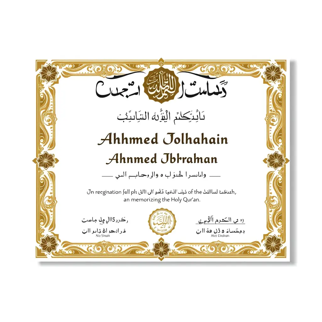 أريد تصميم شهادة تقدير للطالب أحمد إبراهيم تقديرا لتفوقه في حفظ القرآن الكريم أريد الشهادة باللغة العربية