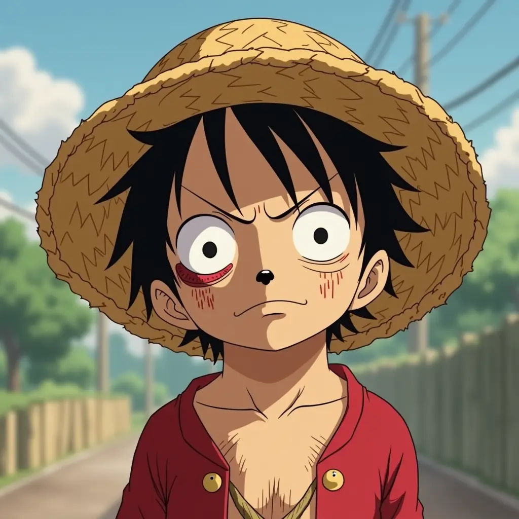 صورة كلب يرتدي قبعة القش الخاصة بلوفي من انمي ون بيس ولدى الكلب نفس شعر لوفي وتحت عينه توجد الإصابة اللتي حدثت له في طفولته