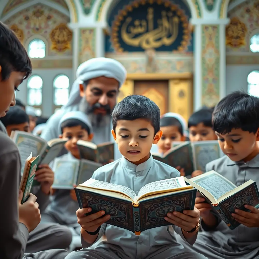 طفل يقرأ القران الكريم في المسجد ومن حوله طلاب صغار يحملون القرآن الكريم والشيخ ينظر لهم