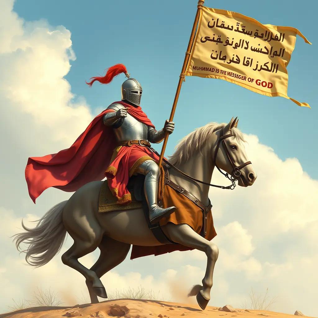 فارس على فرس يحمل راية لا اله الا الله محمد رسول الله باللغة العربية