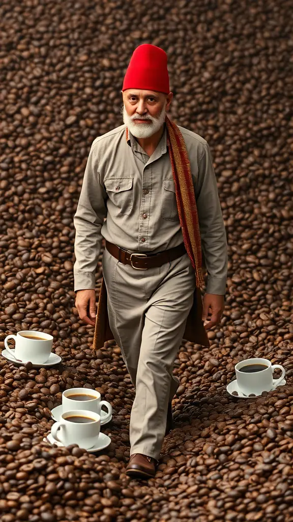 صورة لباشا بالطربوش الاحمر يمشي بتفاخر بين حبات القهوة وفناجين القهوة