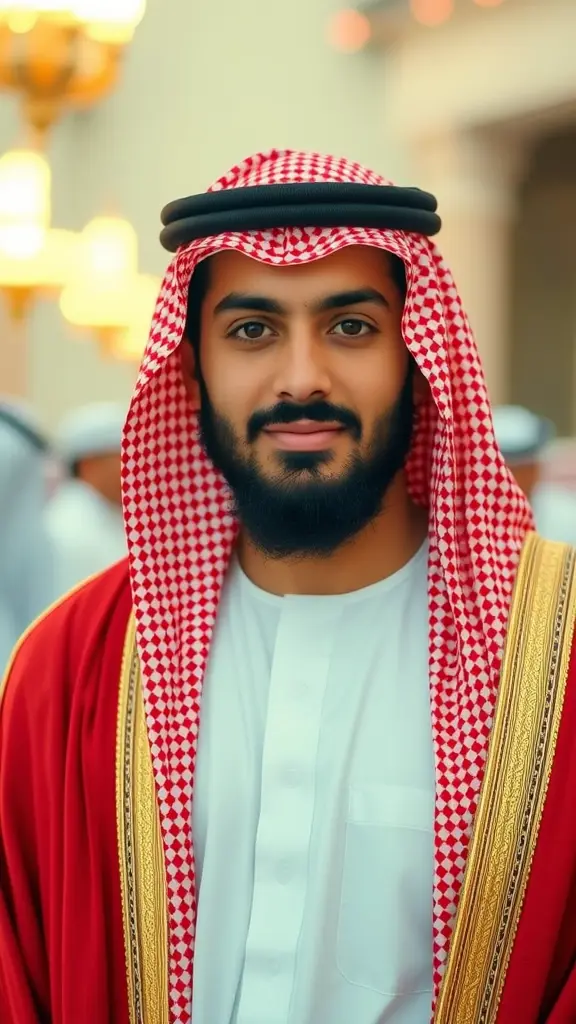 صورة لشاب سعودي وسيم ملتحي لحية شبابة بطول 186 سم ووزن 84 كجم بالزي السعودي والشماغ الاحمر والثوب السعودي بدون بشت يوم العيد