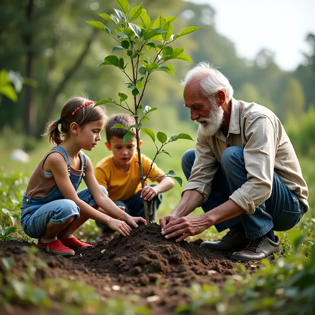 رجل كبير يزرع شجرة وبالقرب منه اطفال صغار يتعلمون منه الزراعة