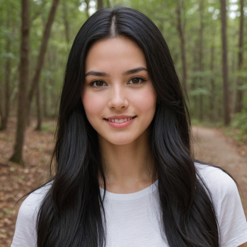 صورة بنت شعرها اسود طويل لون الوجه ابيض وسط لون العينين بني لديها غمازة الوجه دائري  ممتلئ قليلا