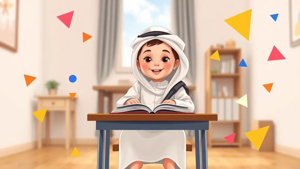 - الطفل: طفل يجلس على مكتب دراسي كليب ارت صغير يرتدي زي خليجي تقليدي، مثل الجلباب الأبيض مع شماغ أو غترة. يبدو الطفل مبتسمًا وفي يداه كتاب مفتوح . - المكان: الغلاف يظهر في غرفة داخلية، مثل غرفة دراسية أو غرفة معيشة بسيطة، مع أثاث بسيط مثل طاولة أو مكتبة خلف الطفل. - الأشكال الهندسية: حول الطفل، توجد أشكال هندسية ملونة وأنيقة مثل المثلثات والمربعات والدوائر، تتناثر بشكل مبدع في المساحة لتضفي طابعًا تعليميًا ومرنًا. يمكن أن تكون هذه الأشكال جزءًا من تركيبة مرحة لتمثيل عالم التعلم والابتكار. - الإضاءة: الضوء يأتي من نافذة أو مصدر إضاءة صناعي، مما يعكس جوًا دافئًا ومريحًا. السماء قد تكون مرئية عبر نافذة الغرفة، إذا كان هناك مشهد خارجي.