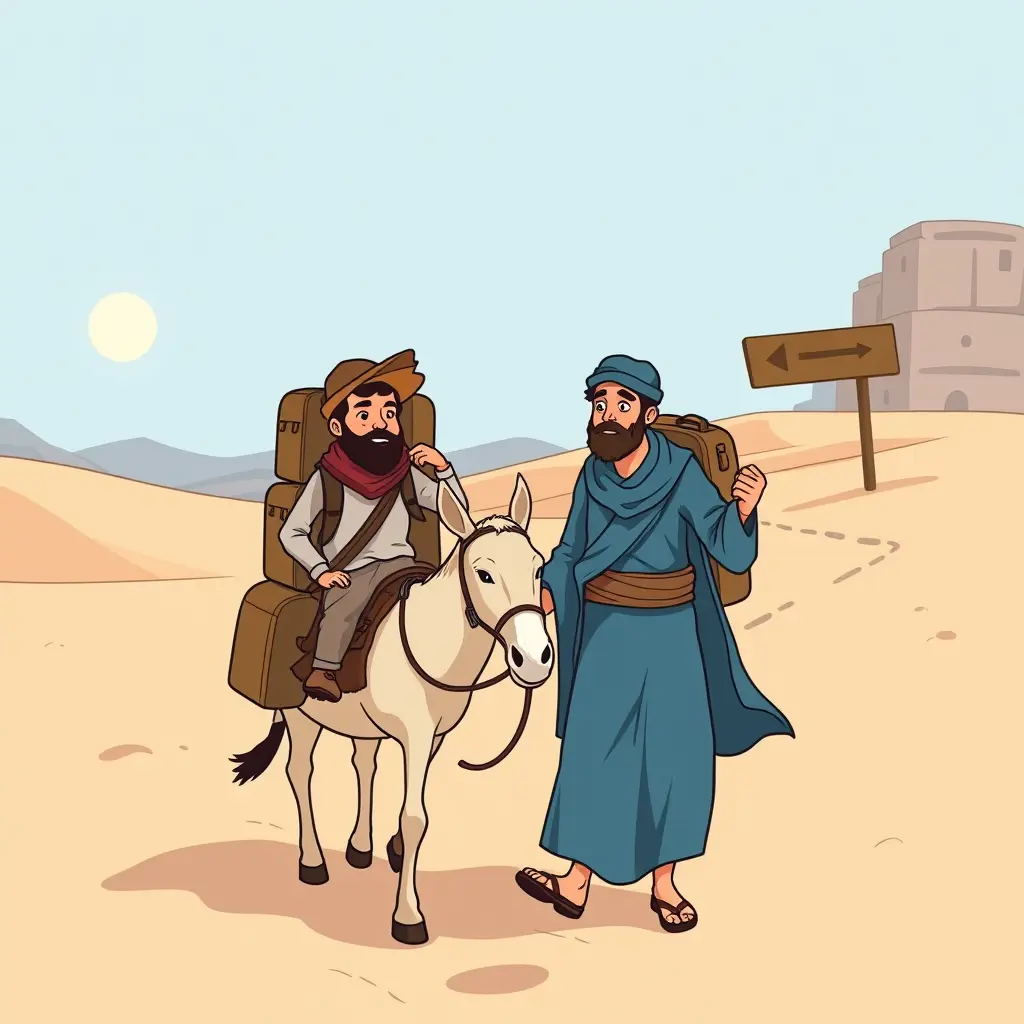 صورة كرتونية لرجل مسافر يحمل امتعته على حمارة وهو مسافر فى الصحراء ويرشدة للطريق  الصحيح رجل اخر
