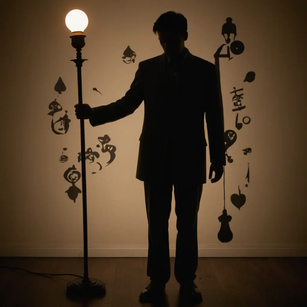 ظل رجل يمسك بيده مصباح محاط برموز فيزيائية