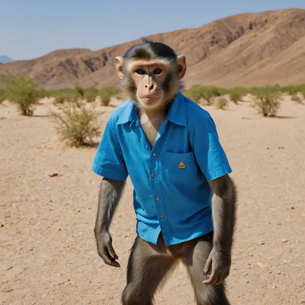 قرد يرتدي قميص ازرق في الصحراء