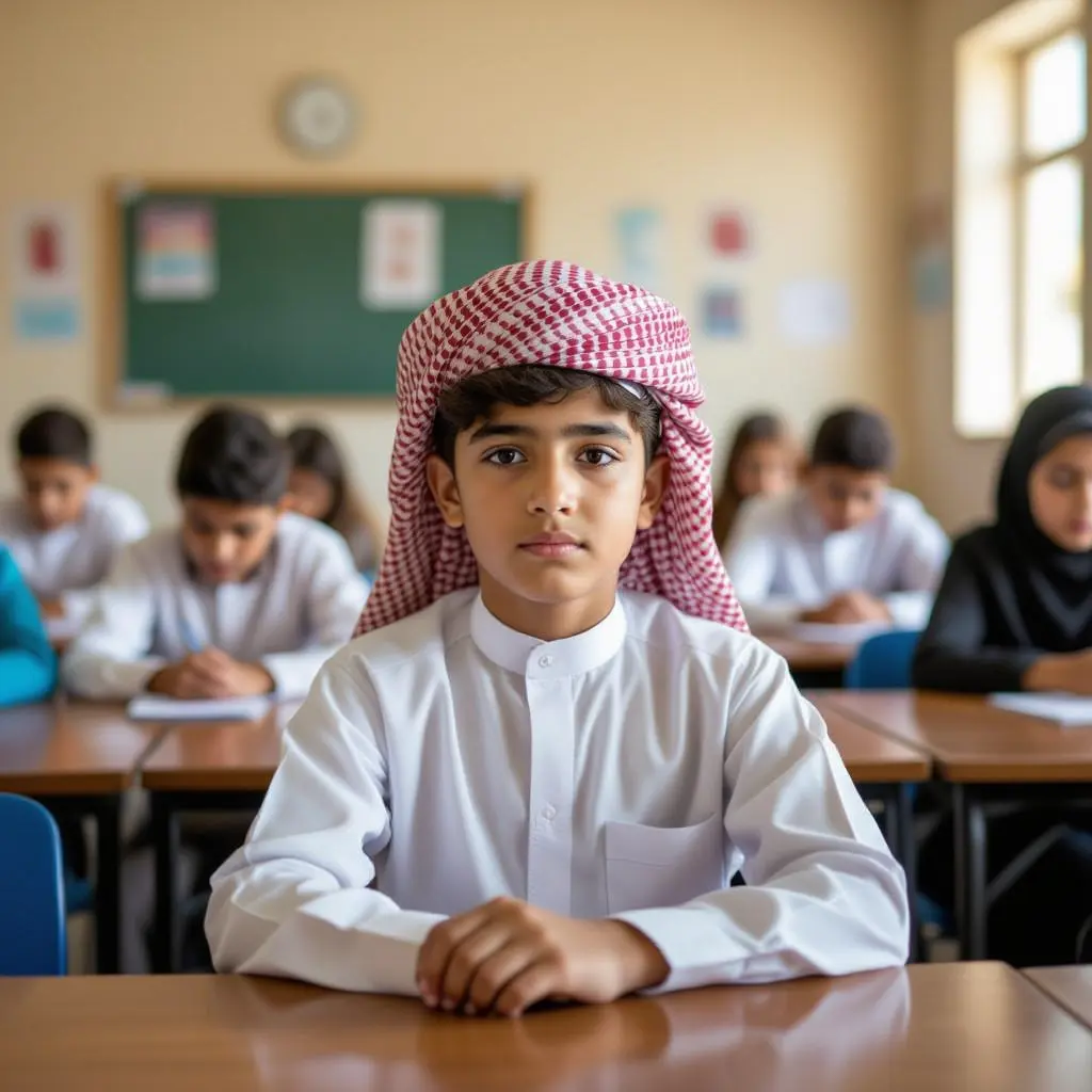 طالب عُماني صغير، يرتي الكمة العمانية والثوب العماني يجلس لوحدة في الصف الدراسي، هذا الطالب حزين وخائف ولا يجلس معه أحد من الطلبة، مع اظهار خلفية البيئة المدرسي، طاولات وكراسي وطلاب