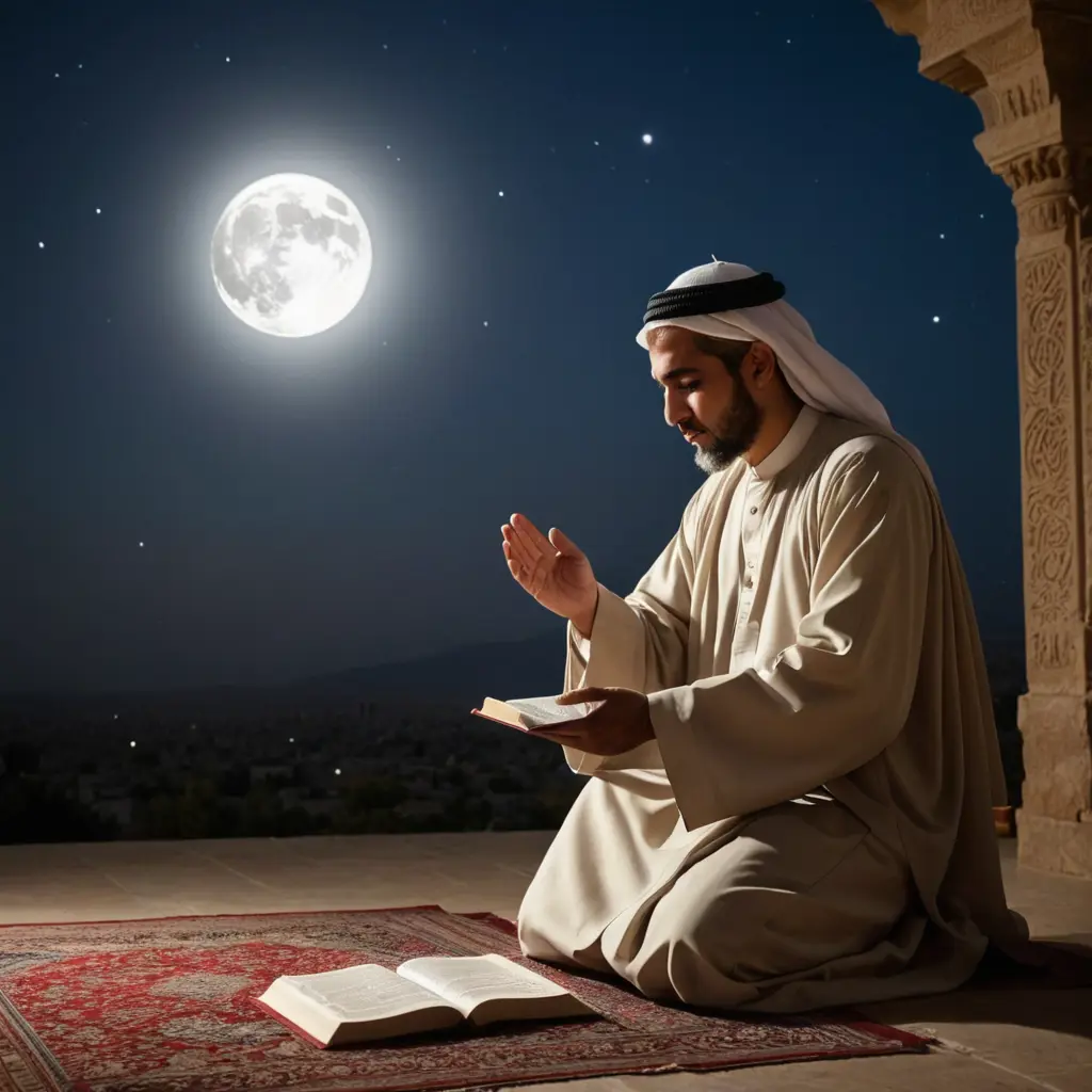 رجل يتضرع الى الله وامامه القرآن الكريم في الليل والبدر في تمامه