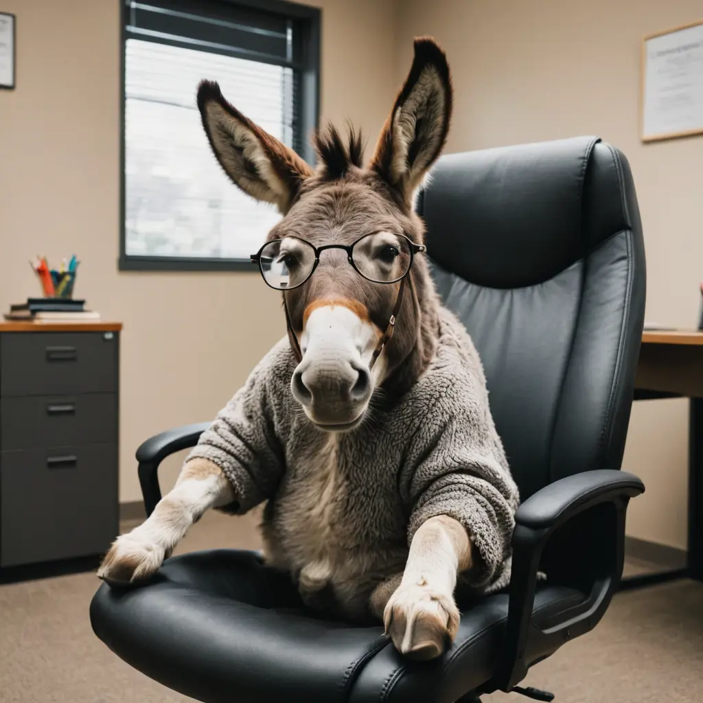 حمار يجلس على كرسي مكتب ويرتدي النظارات